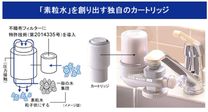 ワンウォーターECOのカートリッジに装着されている不織布フィルターに活性加工を施し、水流の圧触(圧力接触)が起こると、瞬時に水分子の集団を細かく粒子状にした「素粒水」が創られます。