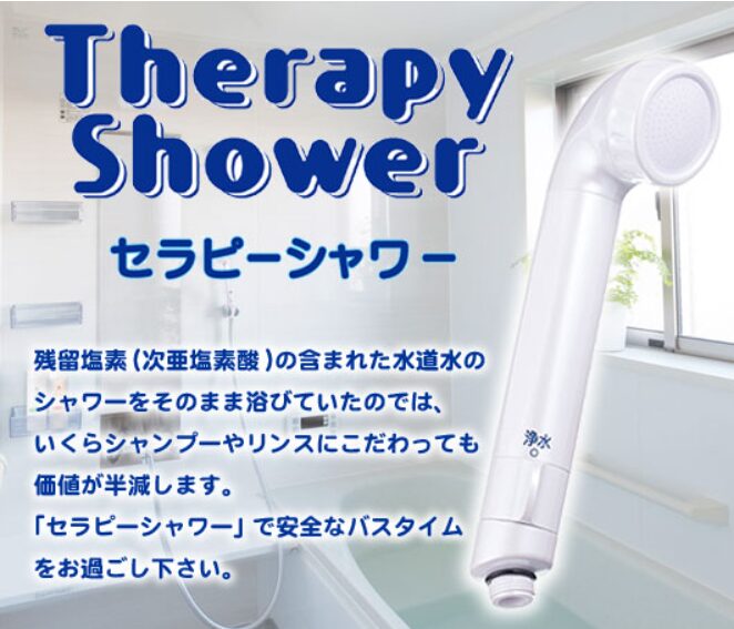 「セラピーシャワー」は繊維活性炭のろ過機能が水道水中の細かな不純物を除去し、素粒水となってシャワー水流を優しくします。